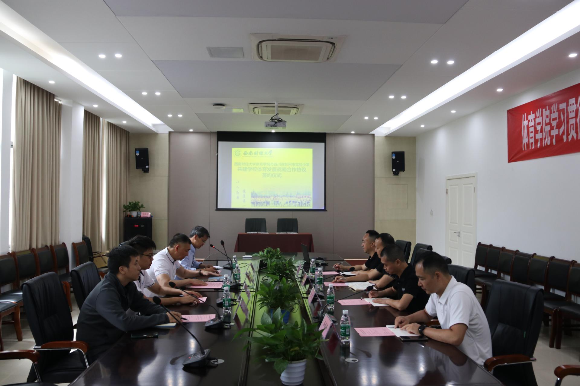 6月6日,西南财经大学OD在线平台与四川省彭州市实验小学共建学校体育发展战略合作协议签约仪式在OD在线平台会议室举行。彭州市实验小学校长胥勇、主任胡宇、体育组组长王潜,教师代表秦德辉;OD在线平台院长杨远波、副院长陈丛刊、院长助理蔡兴林、体育与经济管理研究中心副主任付磊出席签约仪式。