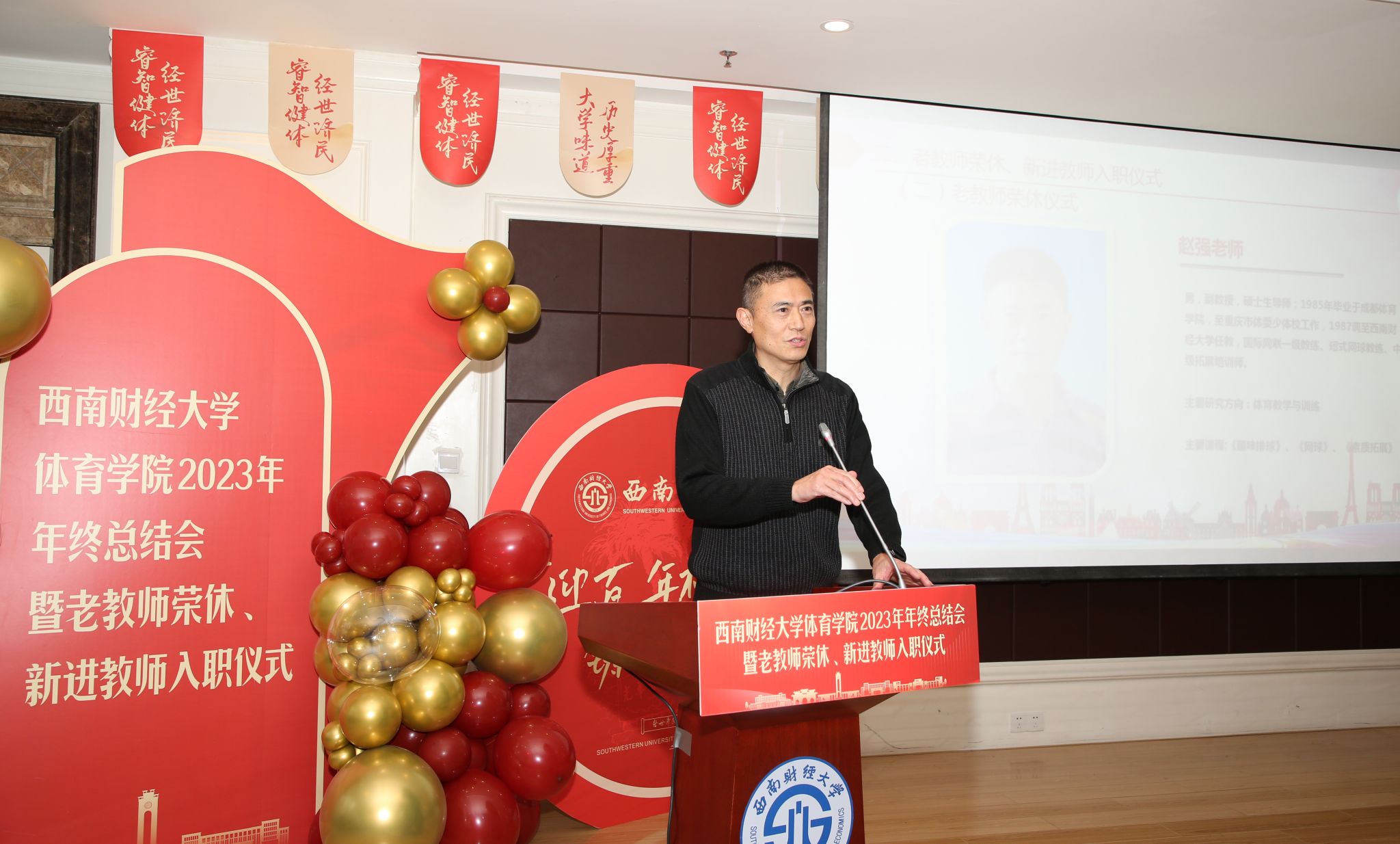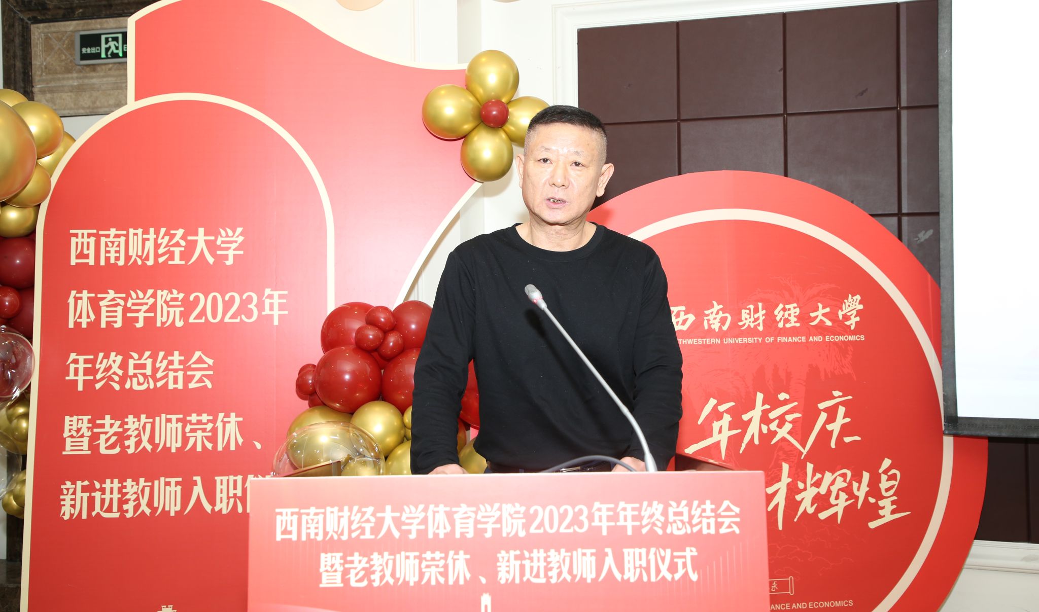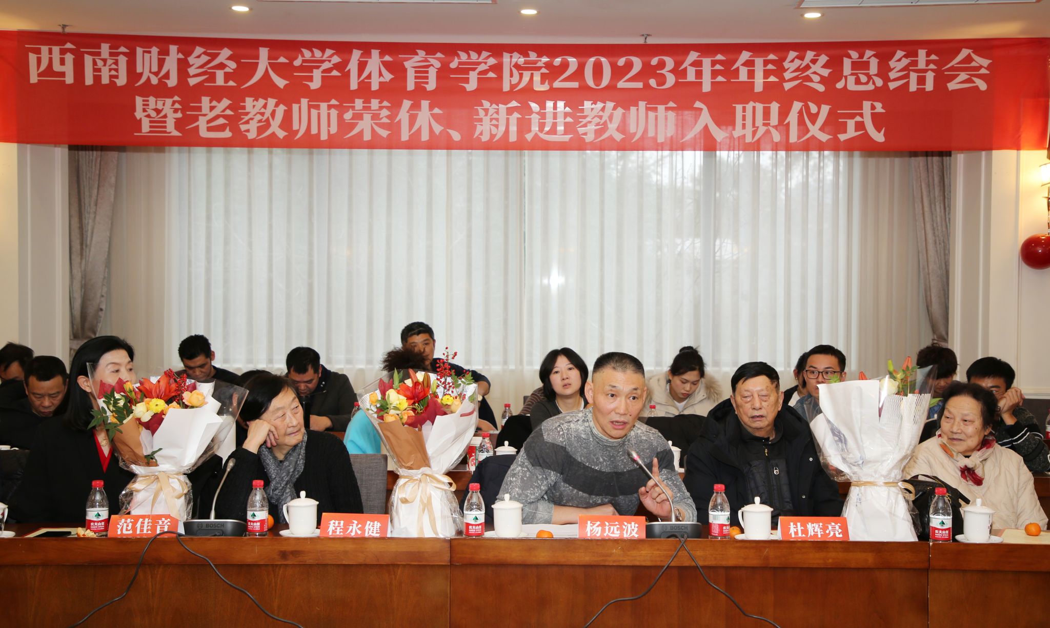 杨远波代表学院向荣休的张堰玲、赵强两位教师表示衷心的感谢并致以良好的祝愿,向新入职的青年教师表示热烈的欢迎。他指出,老教师荣休、新教师入职仪式作为学院师德师风建设的一项重要内容,目的是赓续百年初心,担当育人使命,让红色血脉生生不息、让“睿智健体、经世济民”的西财体育人文精神代代相传。张堰玲、赵强见证了OD在线平台的发展,他们四十年如一日与学院同荣辱、共成长,默默奉献、朴实无华、不求名利,为学院和学校的发展付出了毕生心血、作出了重要贡献。希望老教师们保重身体,一如既往支持学院发展。同时,他对新入职的教师提出希望:坚持“四个相统一”,将立德树人贯穿教书育人全方位全过程,争做“四有好老师”和新时代“大先生”,牢记为党育人、为国育才使命,为培养德智体美劳全面发展的社会主义建设者和接班人作出新的更大贡献。当前,正值全校上下喜迎百年校庆之际,从黄浦、光华、柳林的薪火相传中,汲取西财体育发展的力量,做好冲刺之年学院迎百年校庆的相关筹备工作,是每一位西财体育人光荣的使命和责任,我们一定要凝心聚力、同心筑梦,为学校百年华诞绘就丰富多彩的体育画卷。