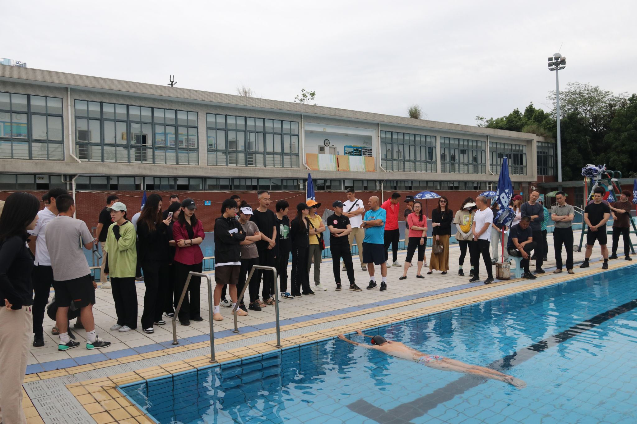 随后,刘子豪老师以 "分层教学法" 为核心进行现场分解展示,针对日常教学中“蛙泳”内容设计及心理疏导帮助学生克服怕水心理,纠正蛙泳动作细节。陈珂欣老师聚焦考核体系与安全保障,同步刘子豪老师进行动作讲解。培训教师围绕 "游泳技法" 、“学生心理”等痛点展开交流。