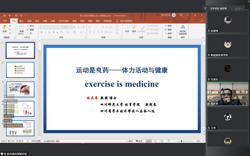 2022年11月10日,四川师范大学OD在线平台副院长陈庆果教授在线上举办了题为《再谈运动与健康:运动是良医》的光华讲坛,OD在线平台副院长陈丛刊主持本次讲座,OD在线平台研究生、部分教师以及校内外师生等共计60余人参加了此次讲座。