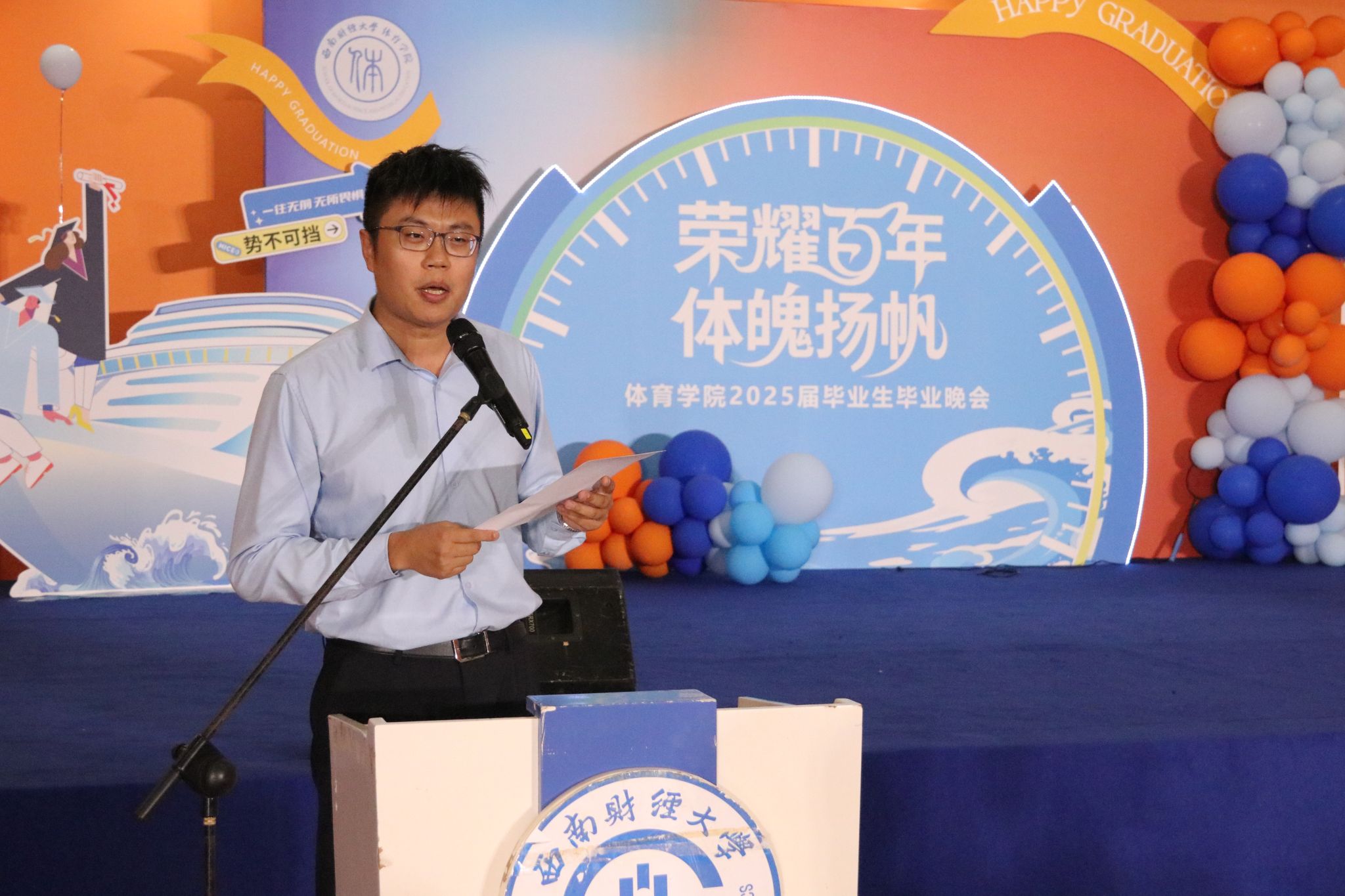OD在线平台主持工作的副院长陈丛刊讲话,他祝贺学院2025届毕业生顺利完成学业。同学们参与了彼此的青春,也见证了相互之间的成长,从陌生到熟悉,是缘分将大家相聚于西财。对于即将踏上人生的新征程,他希望大家永远热烈昂扬,始终保持刚进校园的那一颗颗赤子之心,在未来的工作和生活中发光发热,活出西财体育人的精彩。